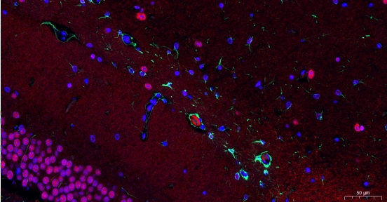 6.加二抗:玻片置于 PBS(PH7.4)中在脱色摇床上晃动洗涤 3 次,每次 8min。切片稍甩干后在圈内滴加与种属对应的荧光二抗,覆盖组织,室温孵育120min。之后玻片置于 PBS(PH7.4)中在脱色摇床上晃动洗涤 3 次,每次 8min;