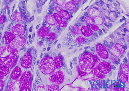 四、染色结果判读:糖原、中性粘液物质呈红色,细胞核呈蓝色。